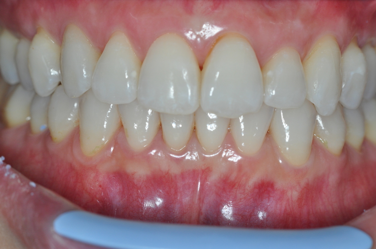 他院でインビザラインマウスピース歯列矯正を終わられ、歯列は綺麗に並びましたが、笑った時の歯形とそれに伴うブラックトライアングルの改善を希望され来院